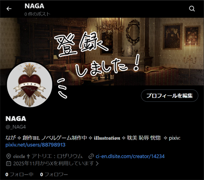 ユーザー名は@_NAG4なのですが、「NAGA」の最後の「A」をleet読みさせて「4」にしています。